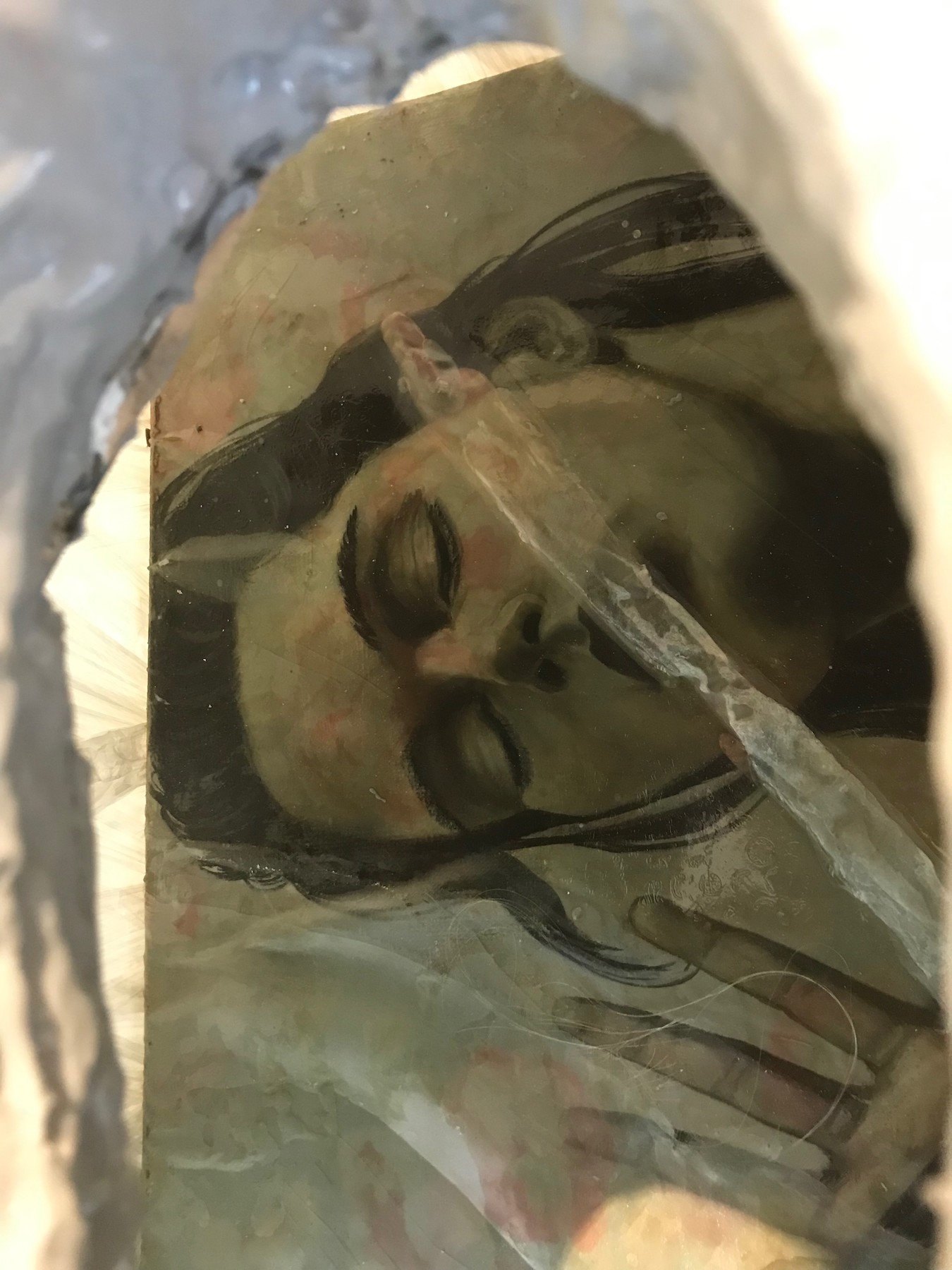 Created in the "wrap" proces with lycra cloth, covered with white silicon and tree roots inside. Inside this coffin like form is an oil and casting resin painting, a soft porn work, painted many years ago. So: Who is the parasite? What is the parasite? does my parasitical behaviour create a form?