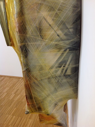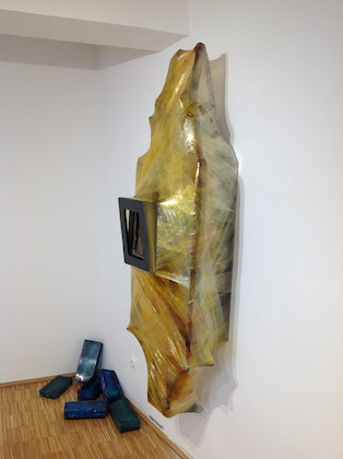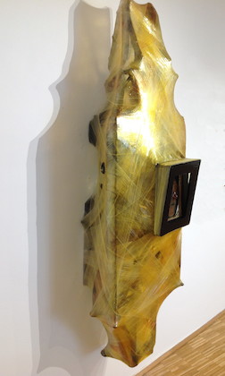 This work is based on a recurring theme of mine: the chrysalis in nature as ideal transformative metamorphic process and the human degenerative form of entrapment of the physical through Mumification in the time of Ancient Egypt and how that might be put to right. ie what might a Modern work of art contribute through the creative process, and the conciousness that the artist might bring to that process. For me, as a student of natural history, the viewing glass of a microscope, or telescope, was a moment of self observation an 'Ich moment' as one crossed a threshold over from a normal sense through to a heightened, magnified world, and so i have often used viewing holes as Self-observations moments. Here one can see a rectangular folding 'observations frame'. The work is built around a Bier/ Litter/ Guerney frame stretched with bicycle tubes and carbon rear forks ( Hinterbau) from cycles which in the process of wrapping provide a very nice Beetle shape (sans Legs) and it just so happens that the Scarabaeus family has several beetles with iridescent bodies. So that was all a very nice conjunction.